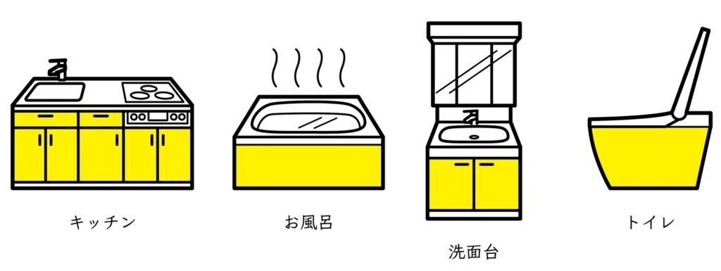 台所、浴室、洗面台、トイレなどの